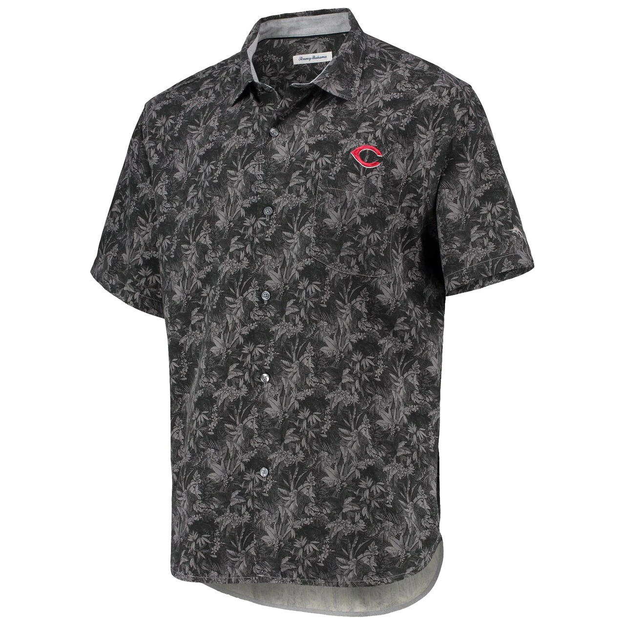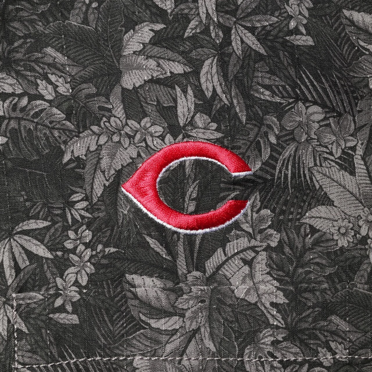 Bring fun vibes on Cincinnati Reds game day in this Jungle Shade Silk Camp button-up shirt from Tommy Bahama. It features an embroidered Cincinnati Reds logo just above the chest pocket and an eye-catching pattern inspired by tropical forests all over. The rounded hem gives this ultra-soft top a more relaxed and comfortable fit, as well.