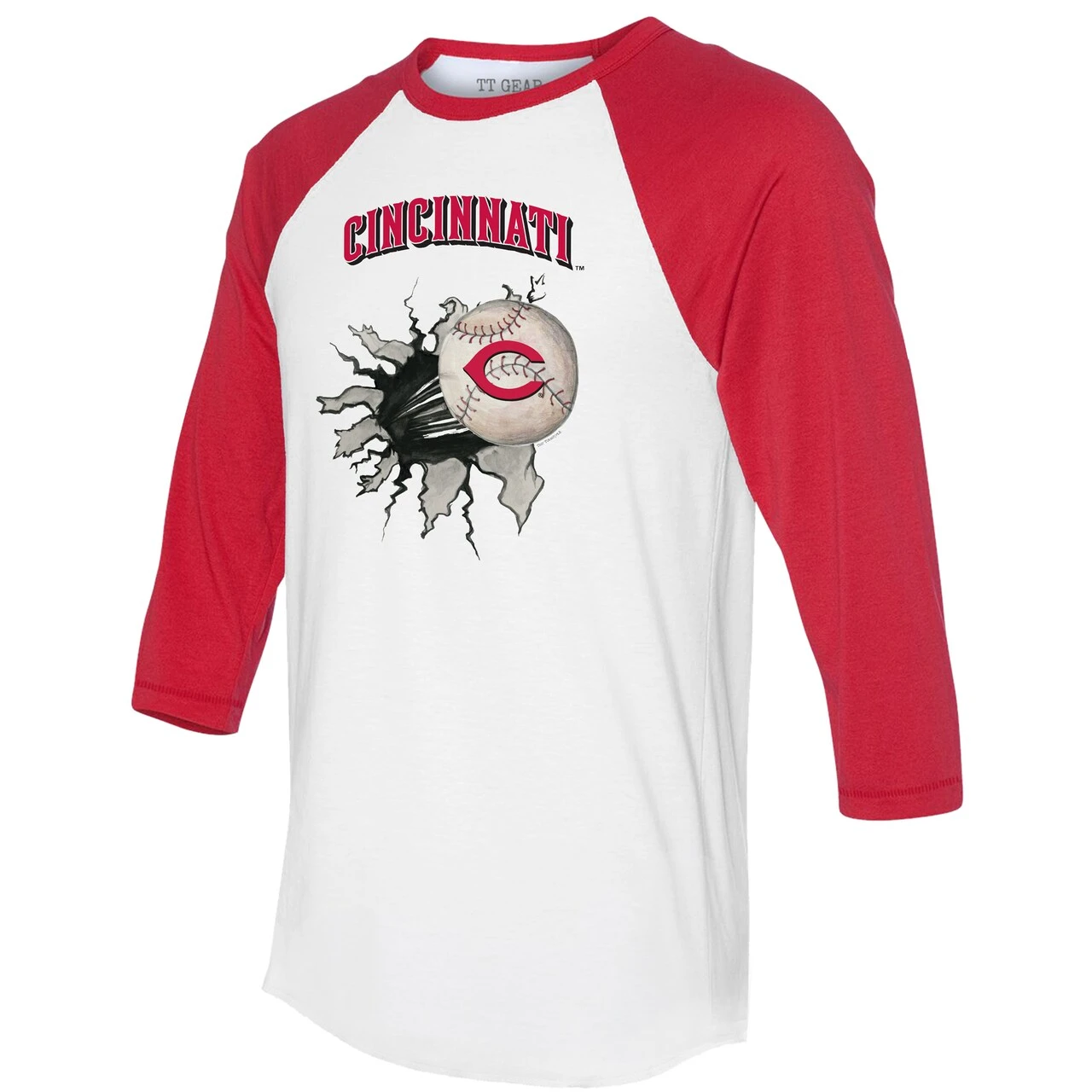 Show off your enthusiasm for Cincinnati Reds game day with this Baseball Tear 3/4-Sleeve Raglan T-Shirt from Tiny Turnip. The raglan sleeves feature a wider underarm area that provides more space for movement, and the 3/4-sleeve length gives you an effortlessly cool and casual look. Matching graphics are also available in youth, toddler and infant sizes, so the whole family can have the same spirited look for the next Cincinnati Reds game.