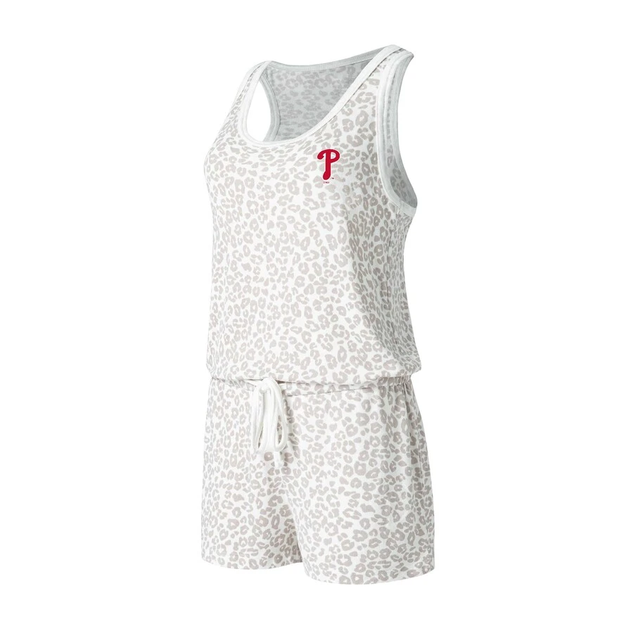For a charming display of Philadelphia Phillies spirit, sport this Montana Hacci romper from Concepts Sport. It features a subtle yet striking Philadelphia Phillies logo on top of a fierce Cheetah pattern. This lightweight fabric blend is perfect for summertime.