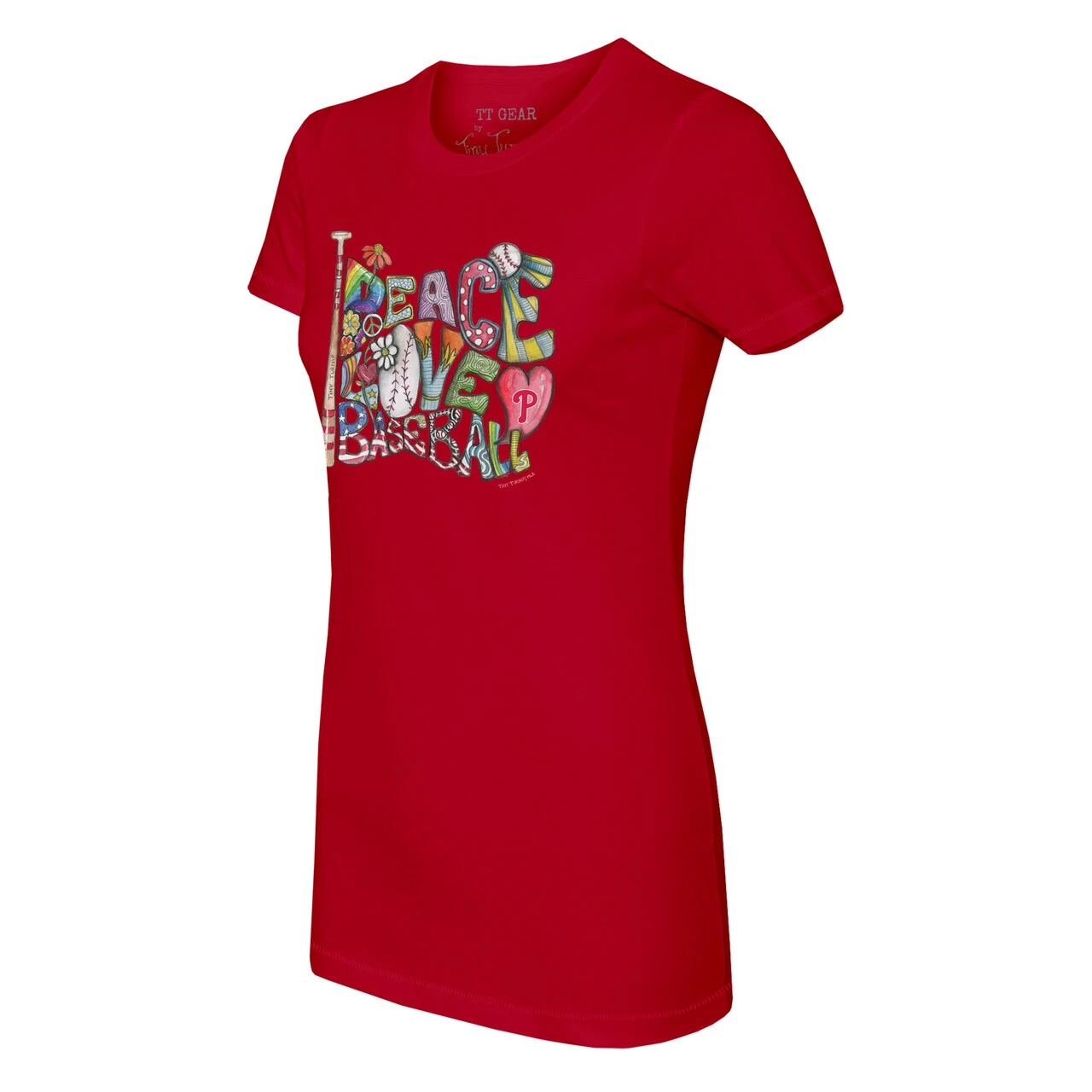 Be the first to review “Women’s Philadelphia Phillies Tiny Turnip Red Peace Love Baseball T-Shirt” Cancel reply