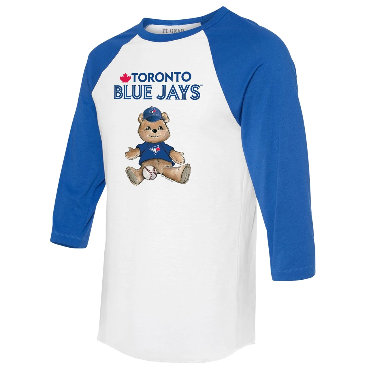 Show off your enthusiasm for Toronto Blue Jays game day with this Teddy Boy 3/4-Sleeve Raglan T-Shirt from Tiny Turnip. The raglan sleeves feature a wider underarm area that provides more space for movement, and the 3/4-sleeve length gives you an effortlessly cool and casual look. Matching graphics are also available in youth, toddler and infant sizes, so the whole family can have the same spirited look for the next Toronto Blue Jays game.
